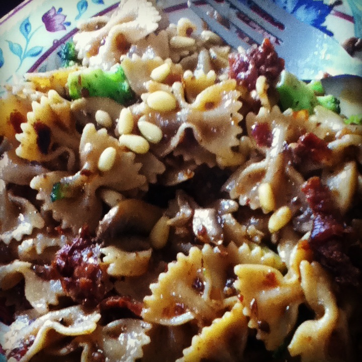 3. Once the pasta is done, drain and add directly to the pan with the vegetables. Add the pine nuts, tossing to coat and cook for another 2 minutes.